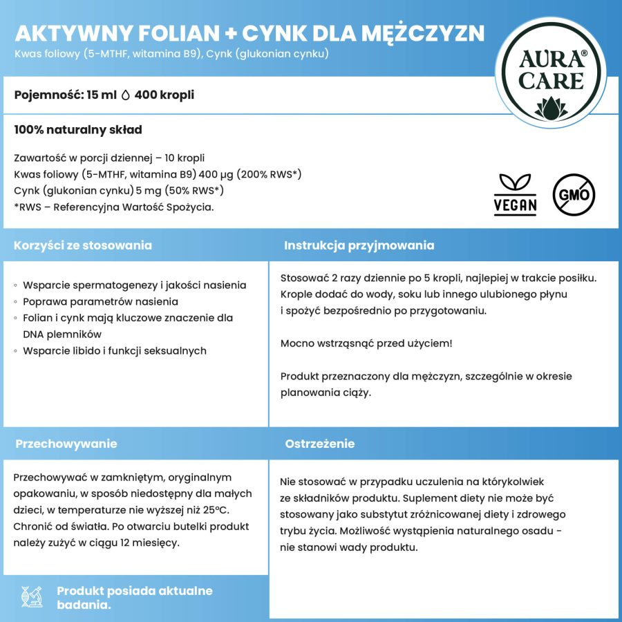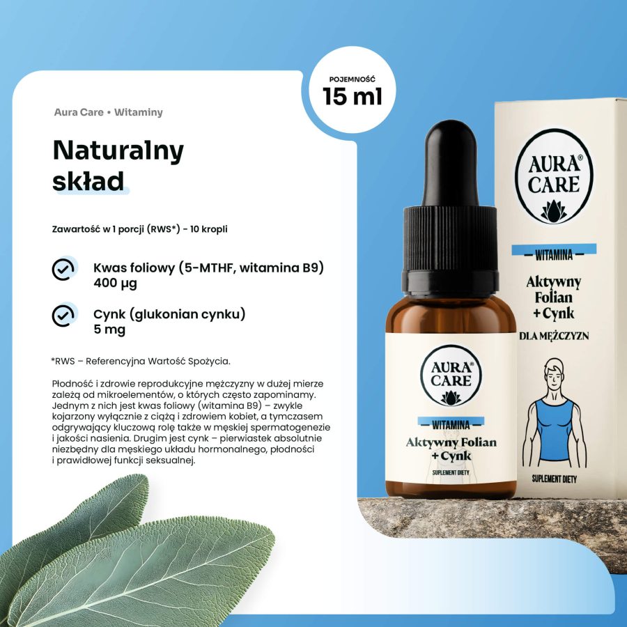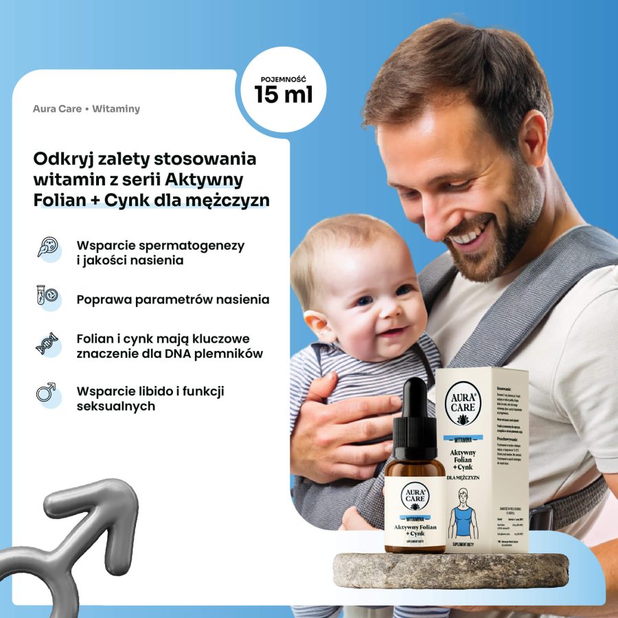 Dlatego stworzyliśmy Aura Care – Aktywny Folian + Cynk – suplement opracowany specjalnie z myślą o mężczyznach, którzy chcą zadbać o swoje zdrowie intymne i przyszłe ojcostwo. Nasza formuła wykorzystuje aktywną postać kwasu foliowego – 5-MTHF, która jest od razu gotowa do wykorzystania przez organizm, oraz cynk w formie glukonianu, o wysokiej biodostępności.
