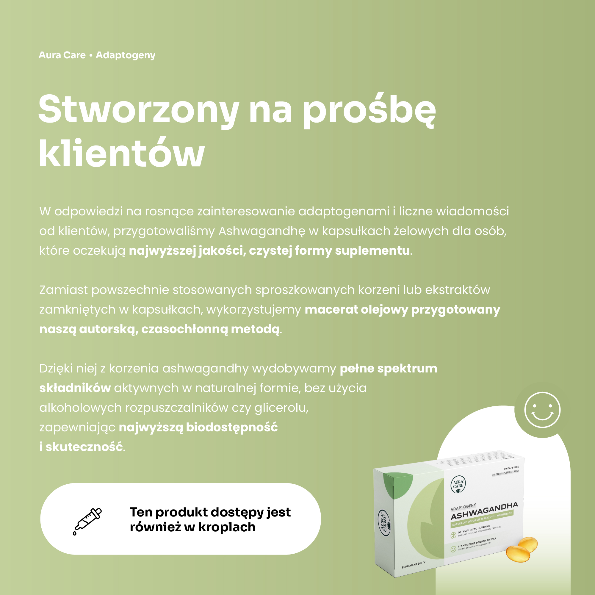 W odpowiedzi na rosnące zainteresowanie adaptogenami i liczne wiadomości od klientów, przygotowaliśmy Ashwagandhę w kapsułkach żelowych dla osób, które oczekują najwyższej jakości, czystej formy suplementu.