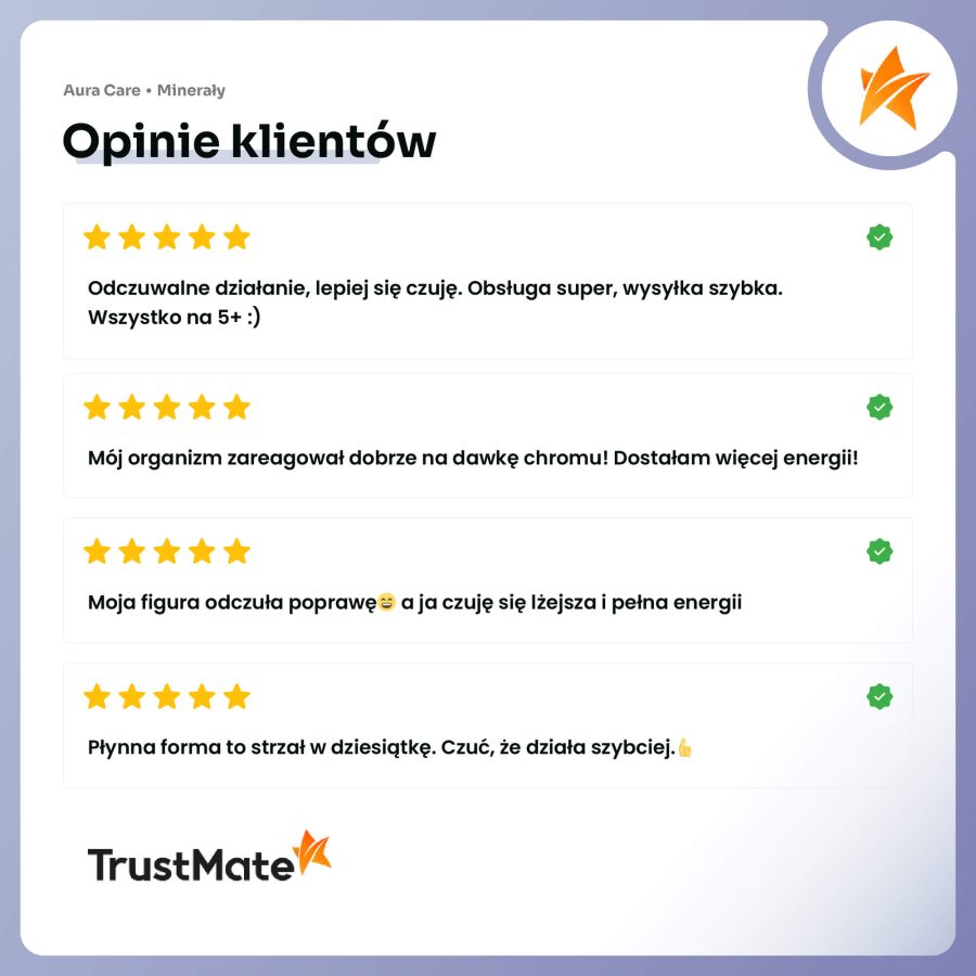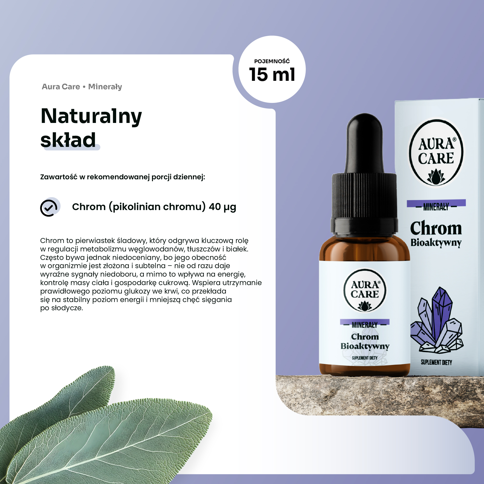 Dlatego stworzyliśmy Aura Care – Bioaktywny Chrom w kroplach, oparty na pikolinianie chromu – najlepiej przyswajalnej formie tego pierwiastka. Jego płynna formuła o delikatnym, pomarańczowym smaku sprawia, że suplement jest wygodny, łatwy w dawkowaniu i szybko wchłaniany przez organizm. To rozwiązanie dla osób, które chcą nie tylko wspierać kontrolę masy ciała i zmniejszyć łaknienie na słodkie, ale także zadbać o metabolizm i stabilny poziom cukru na co dzień.