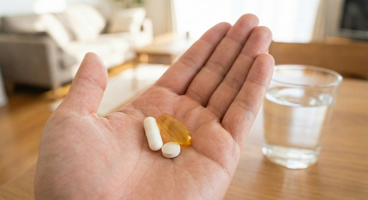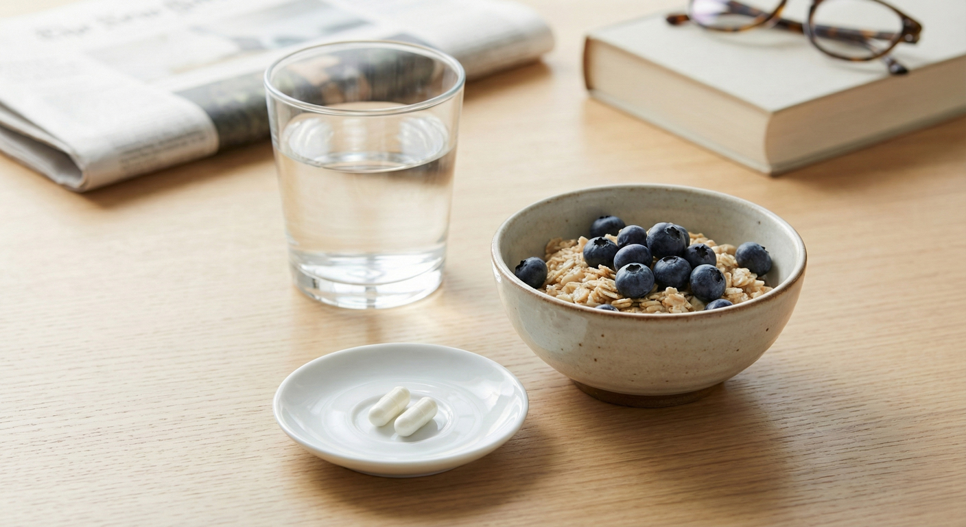 Prosty schemat: po śniadaniu albo razem z poranną rutyną (np. witamina D, omega-3). Jeśli wolisz zachować maksymalną powtarzalność, wybierz jedno stałe „kotwiczenie”, np. „po kawie i śniadaniu” albo „z pierwszym posiłkiem”.