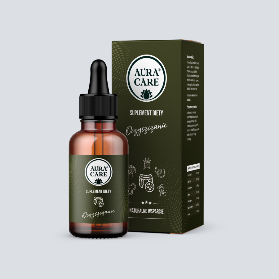 • Aura Care (dla dorosłych): zawiera m.in. orzech włoski, pestki dyni, mniszek lekarski, tymianek, dziurawiec, paczki goździkowca, wrotycz, bylicę piołun oraz adaptogeny. Produkt wspiera kompleksowe oczyszczanie organizmu i jest polecany jako część kuracji naturalnych.
