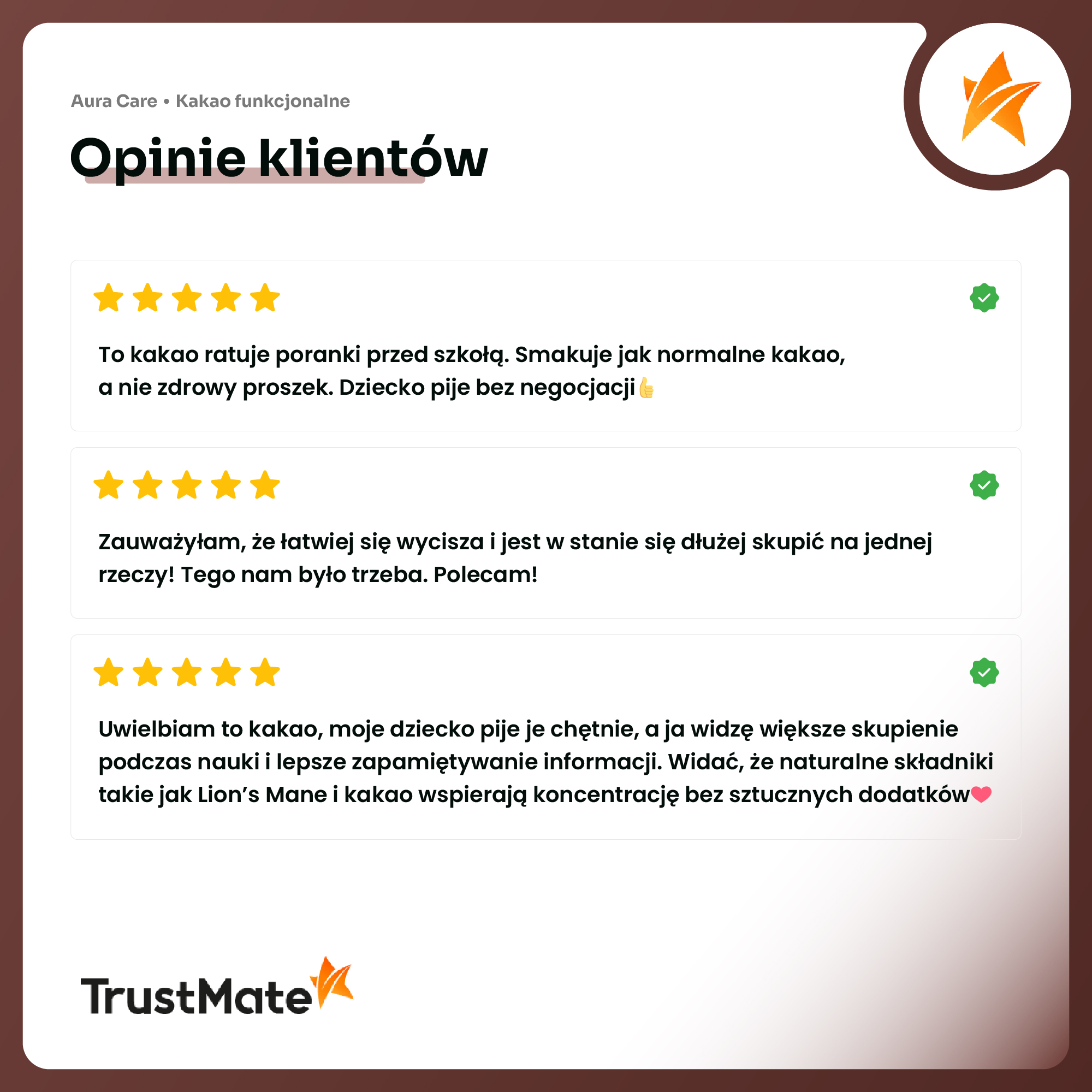 Tworząc nasze kakao, myśleliśmy, o tym, czego potrzebują najmłodsi i co, docenią rodzice. Ma być pysznie, zdrowo i nie wymagać kolejnego wysiłku i budowania nawyku suplementacji. Wykorzystaliśmy składnik, który już dobrze znacie i cenicie — soplówkę jeżowatą zawartą w recepturach olejków Młody Geniusz i Pozytywne Myśli. Poprawa koncentracji, lepsze wyniki w nauce, większe skupienie i spokój – to tylko niektóre opinie, jakie nam zostawiacie. Dlatego, jej ekstrakt połączyliśmy z czystym kakao.