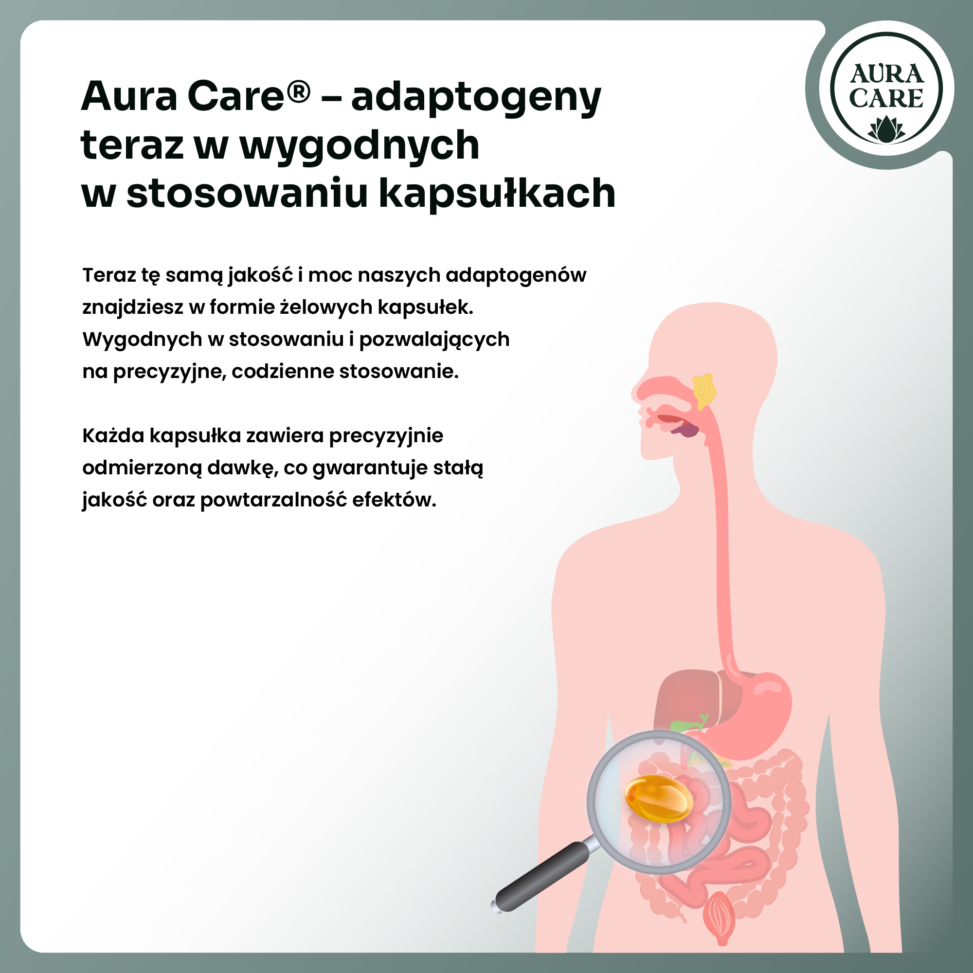 Aura Care – Koncentracja w kapsułkach żelowych to odpowiedź na prośby klientów, którzy pokochali naszą wersję w kroplach. Autorska kompozycja adaptogenów wspierająca skupienie, pamięć roboczą i jasność myślenia jest teraz dostępna w małych, miękkich kapsułkach, które można przyjąć w dowolnym momencie dnia.