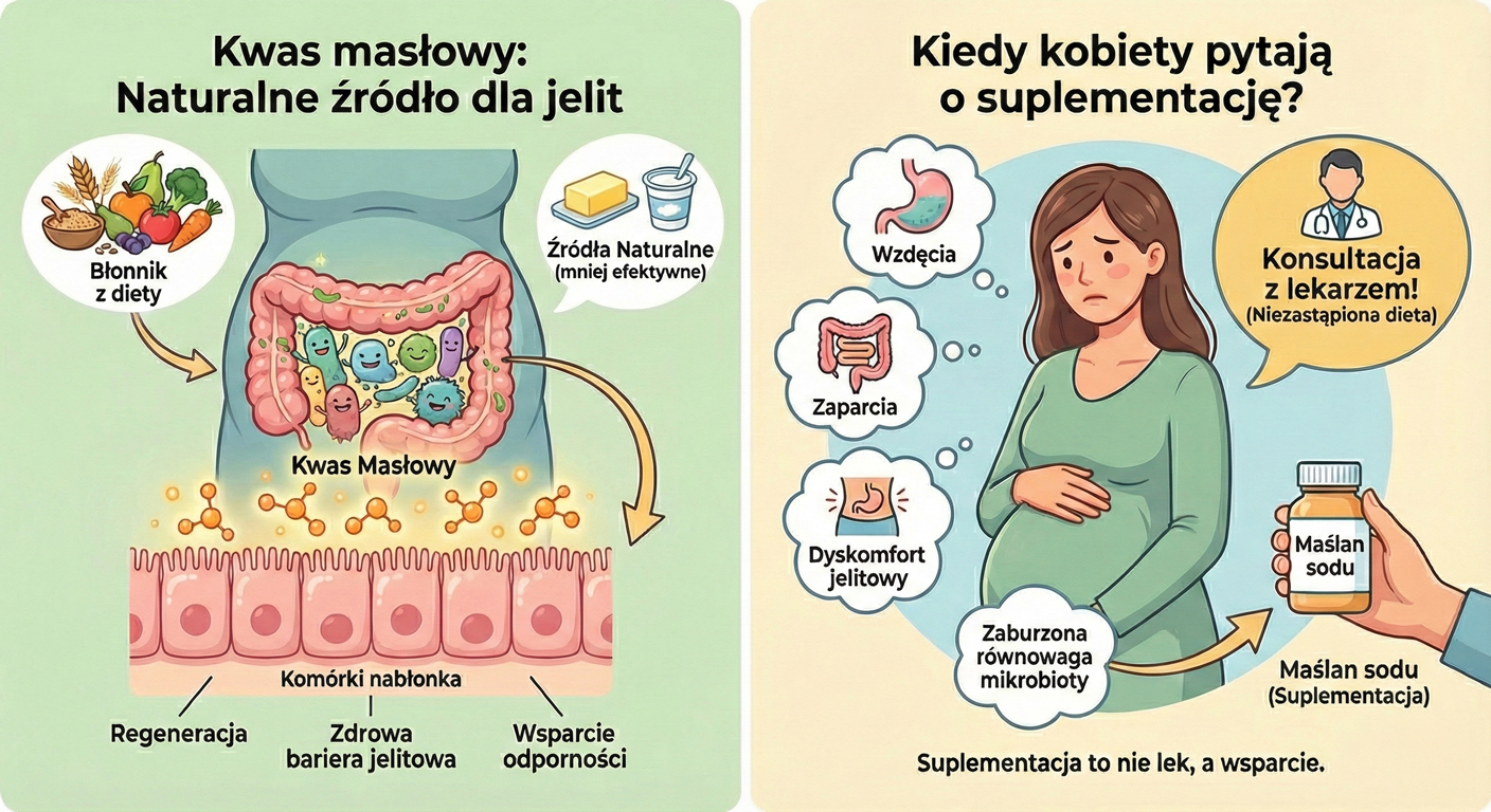Kobiety w ciąży mogą rozważać suplementację maślanem sodu, gdy zauważają u siebie zmiany w funkcjonowaniu układu pokarmowego, takie jak wzdęcia, zaparcia czy dyskomfort jelitowy, które mogą wynikać m.in. z zaburzeń równowagi mikrobioty jelitowej. W takich sytuacjach niektóre przyszłe mamy poszukują sposobów na wsparcie ogólnej kondycji jelit. Ważne, aby każdą decyzję podejmować ostrożnie i po konsultacji z lekarzem – suplementacja maślanem sodu nie jest lekiem i nie powinna zastępować zbilansowanej diety.