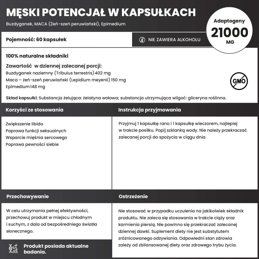 - Zwiększenie libido: Składniki zawarty w "Męskim potencjale", takie jak MACA i buzdyganek - są znane ze swoich właściwości zwiększających libido i poprawiających pożądanie seksualne. Regularne stosowanie tego produktu może przyczynić się do ożywienia życia seksualnego i poprawy relacji intymnych. (EFSA-Q-2008-3564) (EFSA-Q-2008-4145)