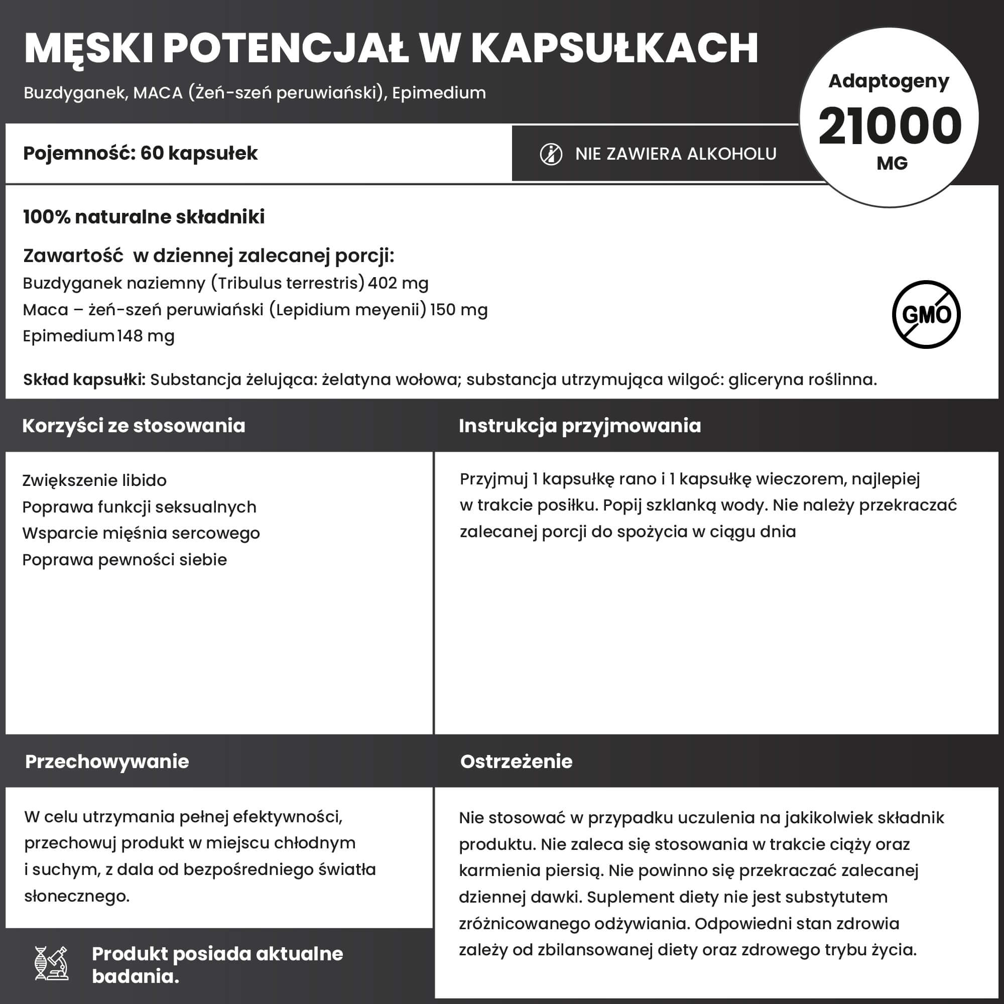 Dlatego stworzyliśmy kapsułki żelowe, które zachowują tę samą autorską kompozycję adaptogenów, a dzięki łatwości stosowania pomagają utrzymać regularność suplementacji – kluczową dla trwałych efektów w obszarze libido, energii i kondycji.