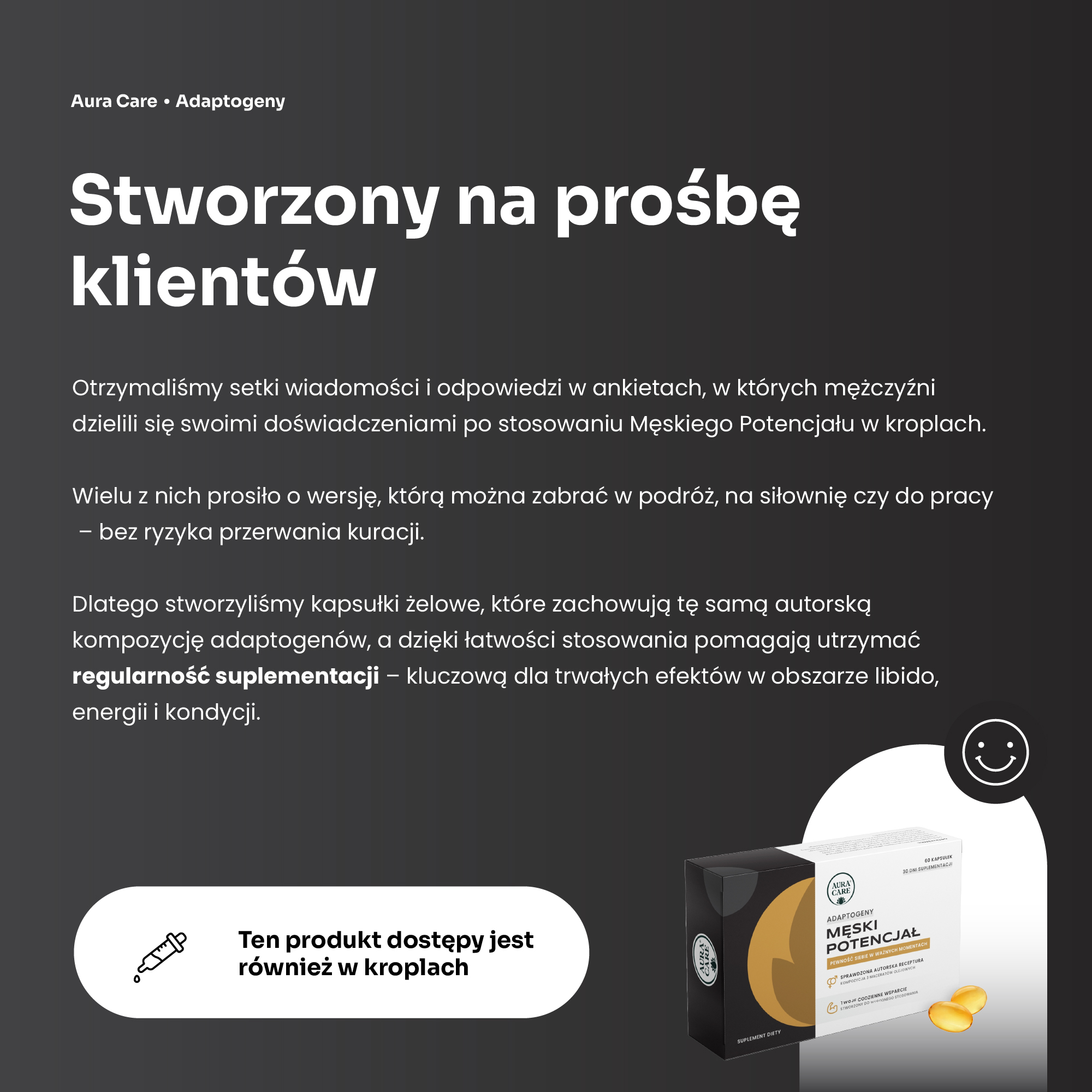 Aura Care Męski Potencjał w kapsułkach żelowych to odpowiedź na prośby mężczyzn, którzy pokochali naszą wersję w kroplach, ale chcieli tak samo skutecznego wsparcia w jeszcze prostszej i bardziej mobilnej formie.