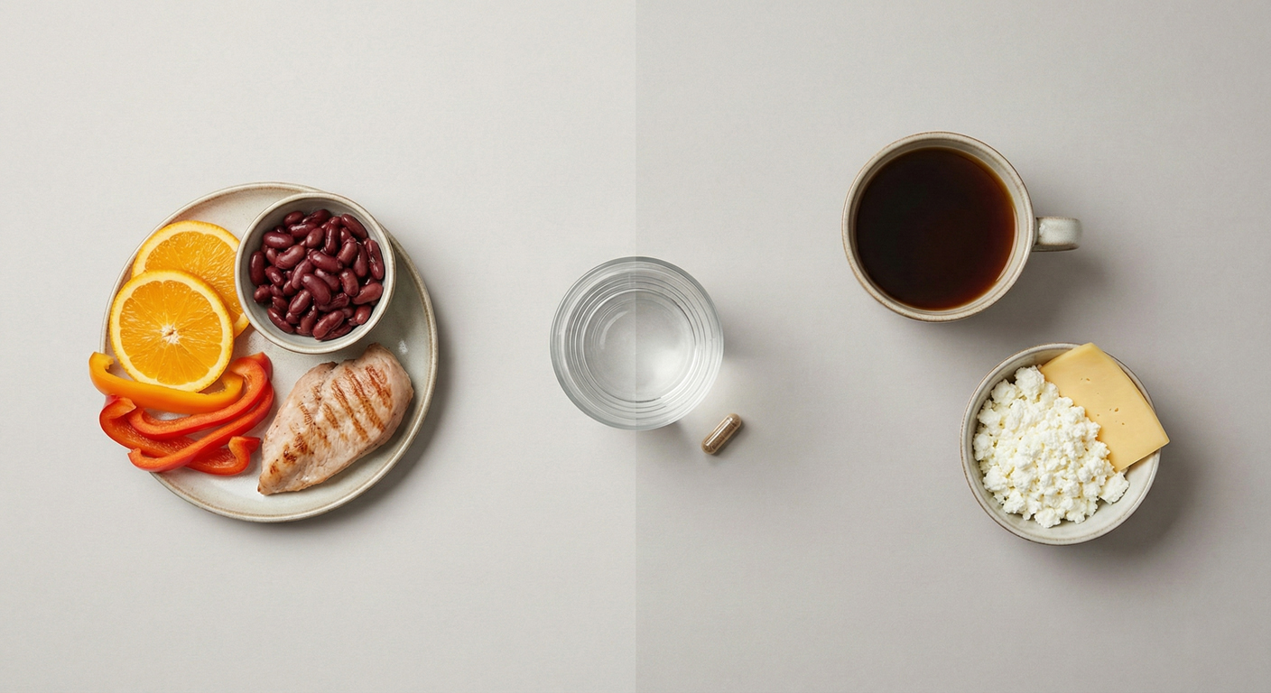 - łączenie źródeł żelaza z posiłkiem, który je „wspiera” (praktycznie: sensowny posiłek zamiast chaosu żywieniowego)