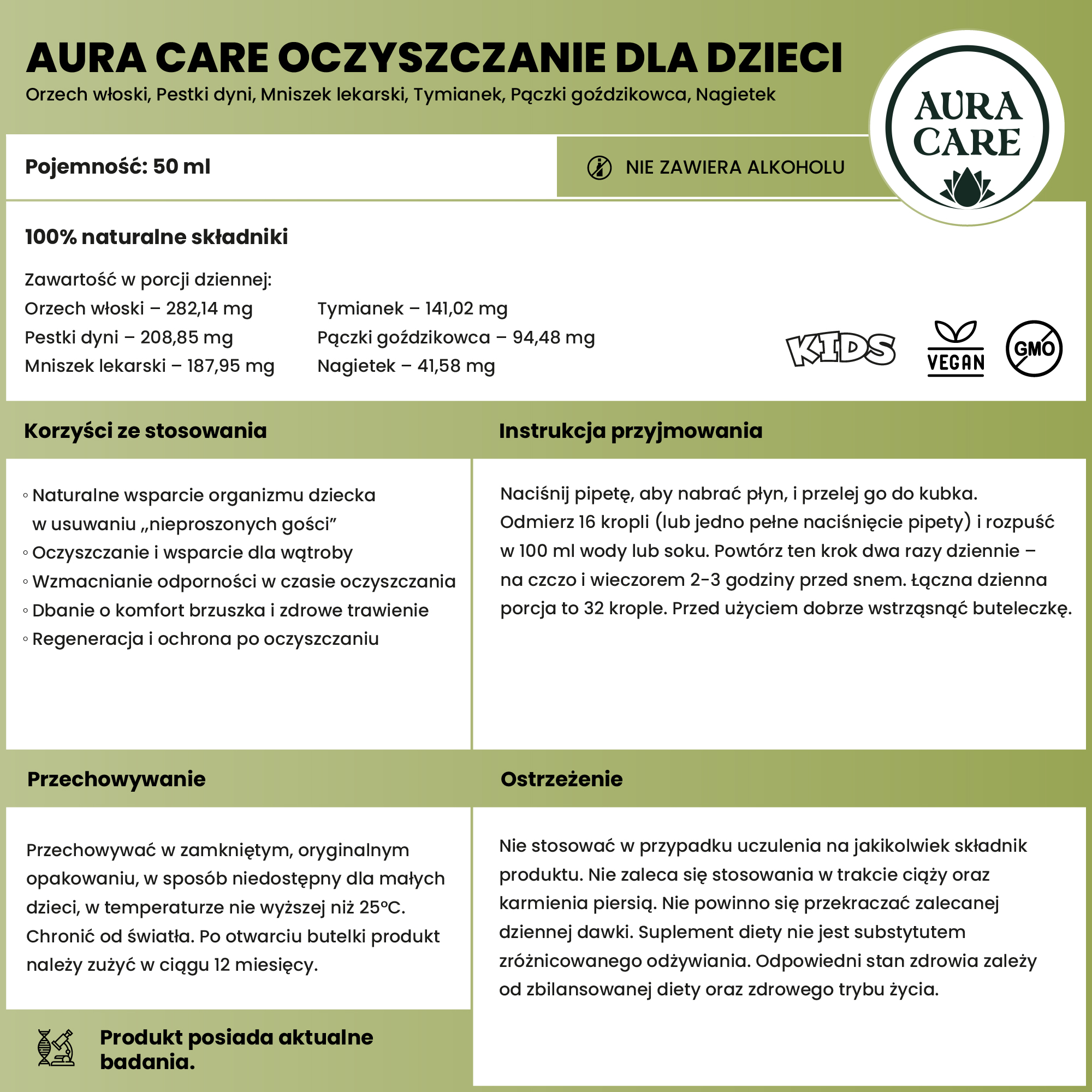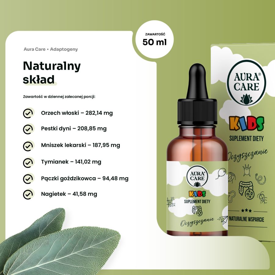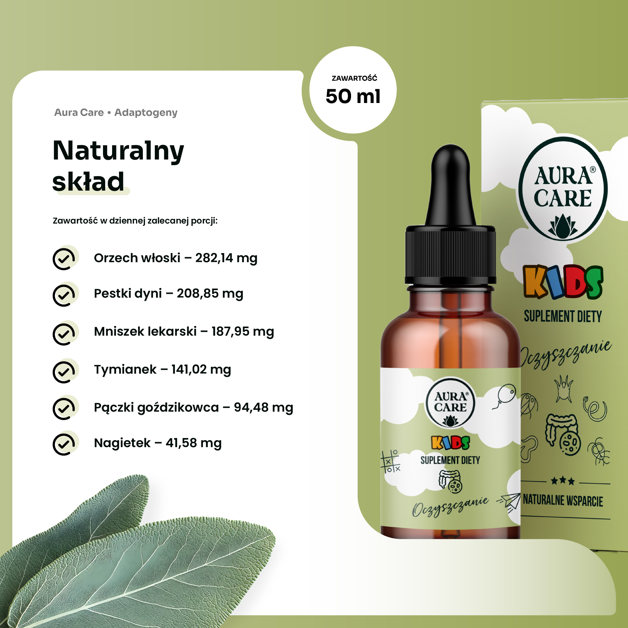 Aura Care – Oczyszczanie Kids to łagodne, roślinne wsparcie, które pomaga pozbyć się „nieproszonych gości” i wspiera naturalne procesy oczyszczania, w tym pracę wątroby – bez chemii i bez obciążania delikatnego organizmu dziecka.