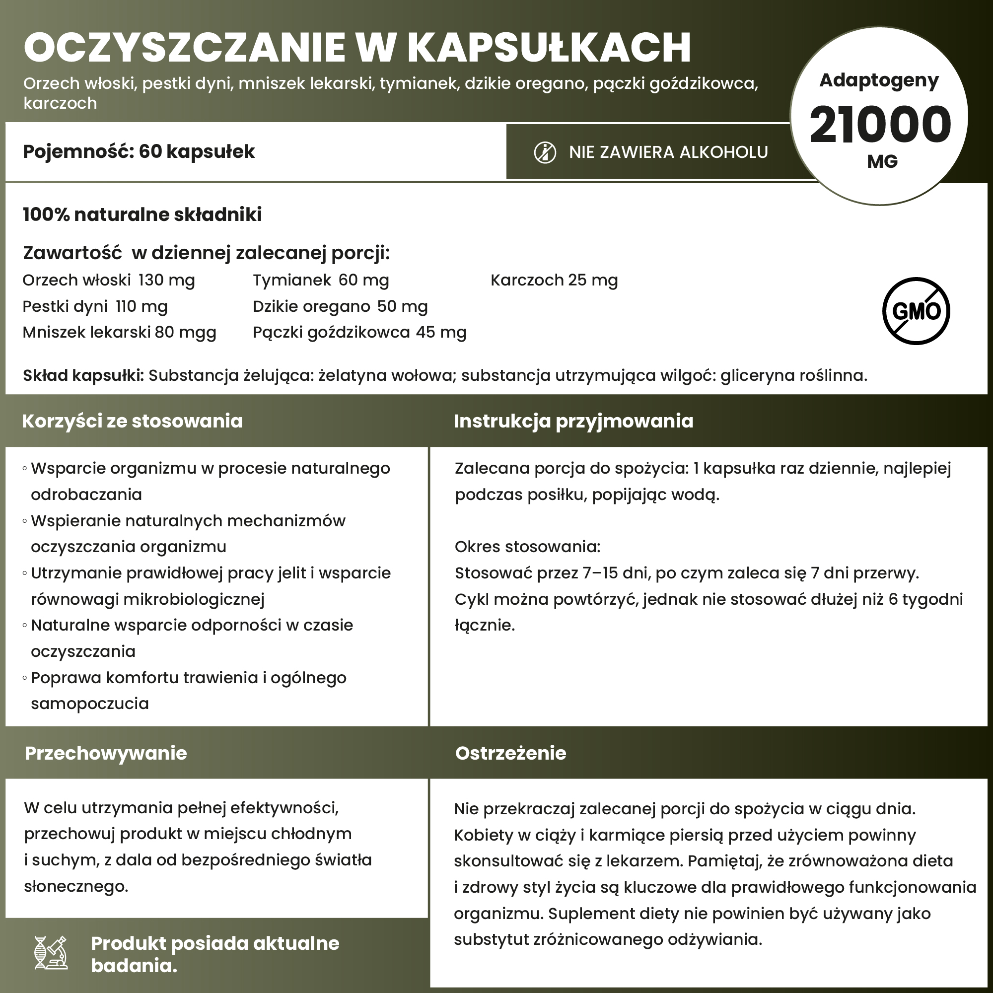 Zioła o silnym działaniu oczyszczającym, takie jak orzech włoski, goździkowiec i dzikie oregano, wspierają organizm w utrzymaniu środowiska niekorzystnego dla rozwoju pasożytów i drobnoustrojów. Ich synergiczne działanie od lat wykorzystywane jest w naturalnych kuracjach oczyszczających, które pomagają dbać o czystość jelit i prawidłowe funkcjonowanie układu trawiennego (1). - Wspieranie naturalnych mechanizmów oczyszczania organizmu