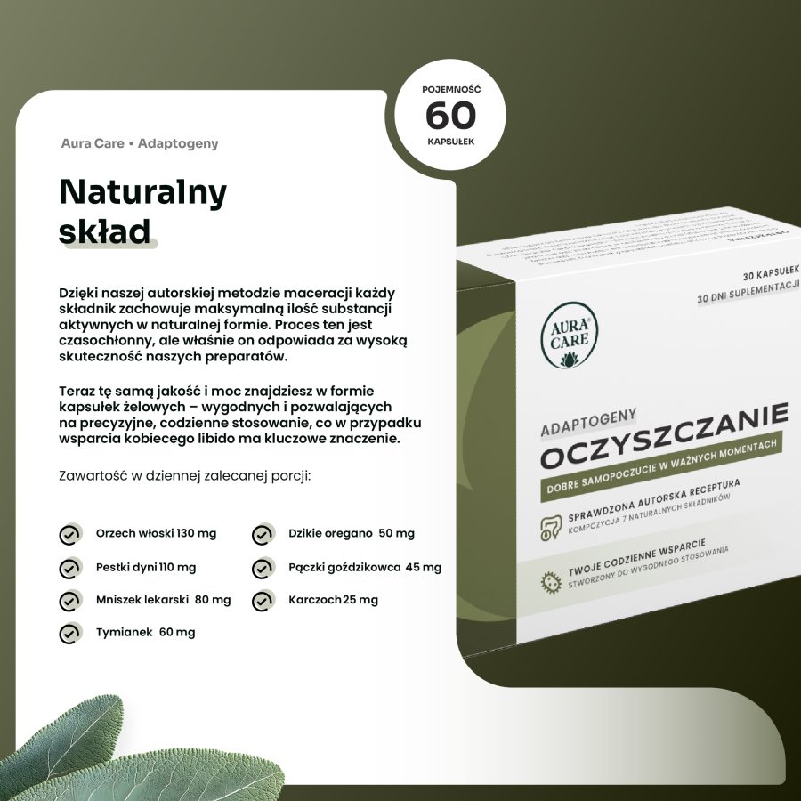 Aura Care – Oczyszczanie w kapsułkach łączy w sobie moc siedmiu roślin, które od wieków wykorzystywane były w tradycyjnych metodach wspierania oczyszczania organizmu i utrzymania mikrobiologicznej równowagi. To synergiczne połączenie natury i wiedzy zielarskiej, które wspiera ciało w usuwaniu tego, co zbędne, i przywraca wewnętrzną harmonię.