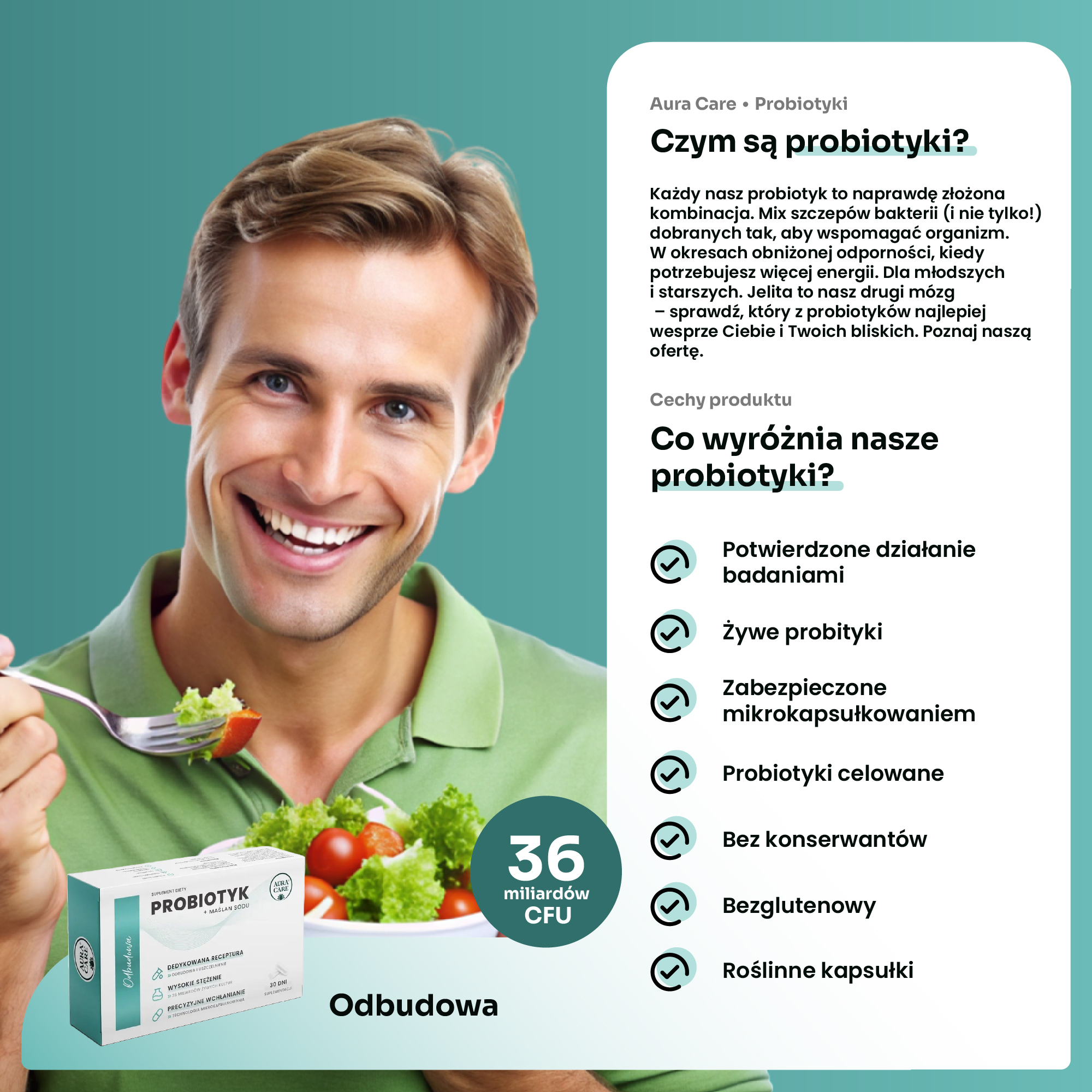 <b>Odbudowa z Maślanem Sodu </b><br> Probiotyk + prebiotyk, żywe probiotyki<br><small> Probiotyki Aura Care | 36 miliardów CFU</small>