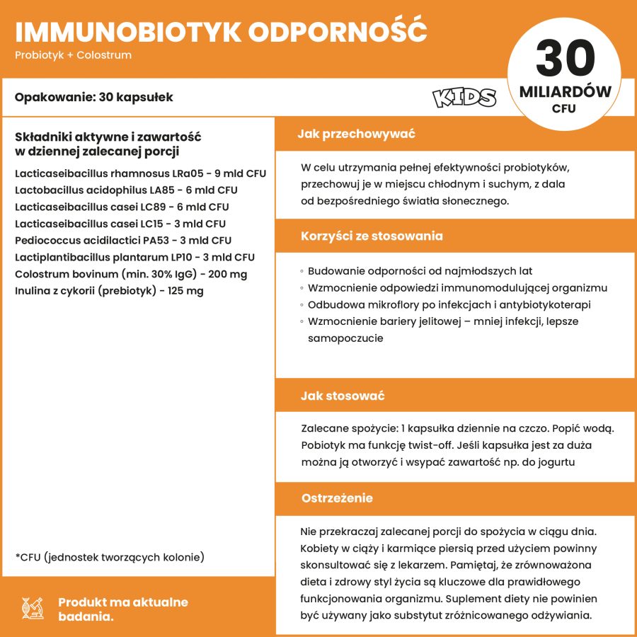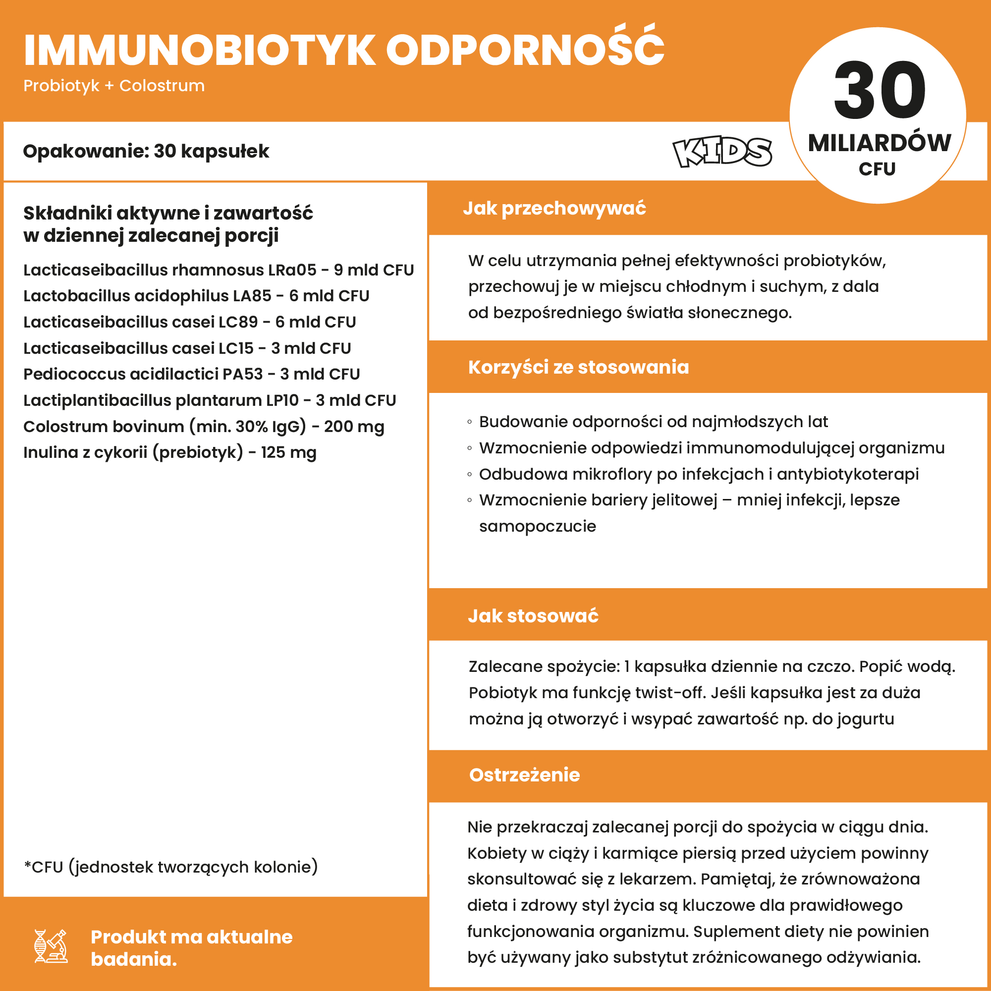 Układ odpornościowy dziecka rozwija się przez pierwsze lata życia – to właśnie wtedy warto zadbać o jego prawidłowe dojrzewanie. Jelita, w których znajduje się aż 70% komórek odpornościowych, odgrywają w tym kluczową rolę. Zawarte w Immunobiotyku Kids szczepy Lacticaseibacillus rhamnosus i Lactobacillus acidophilus wspierają równowagę mikroflory jelitowej, tworząc solidny fundament naturalnej odporności.