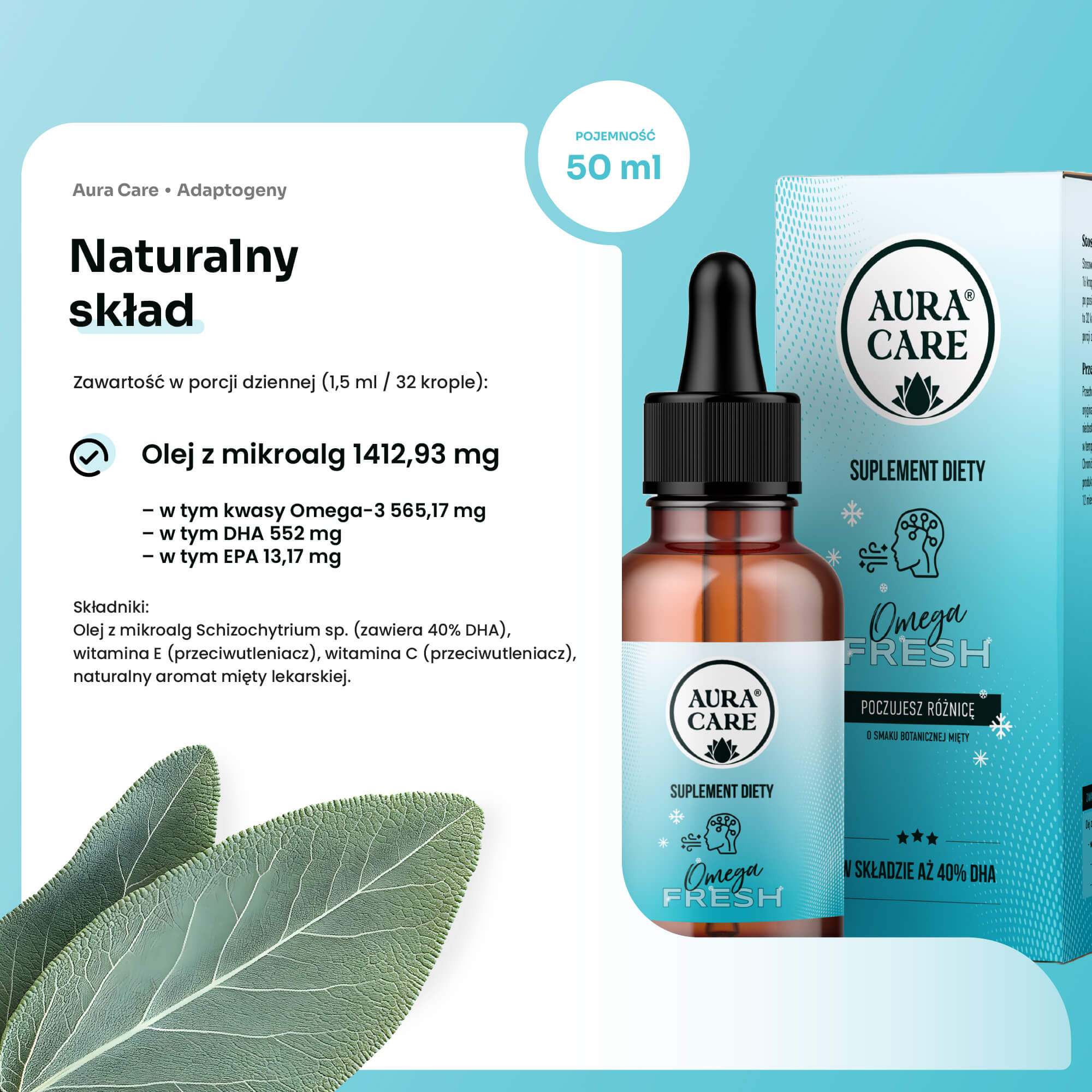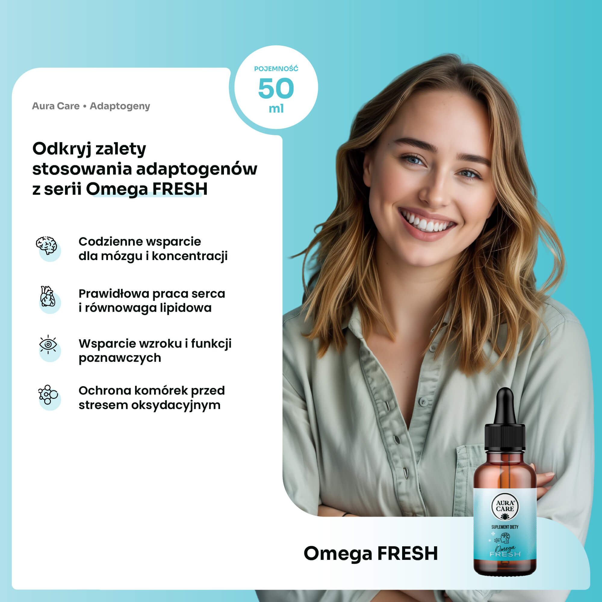 Codzienna suplementacja jeszcze nigdy nie była tak prosta i przyjemna. Omega Fresh to inteligentne połączenie 2w1 – czystych kwasów omega-3 z mikroalg i naturalnego odświeżenia po posiłku. Zamiast kolejnej kapsułki – kilka kropli, które jednocześnie wspierają Twój organizm, poprawiają trawienie i odświeżają oddech dzięki naturalnemu olejkowi z mięty lekarskiej.