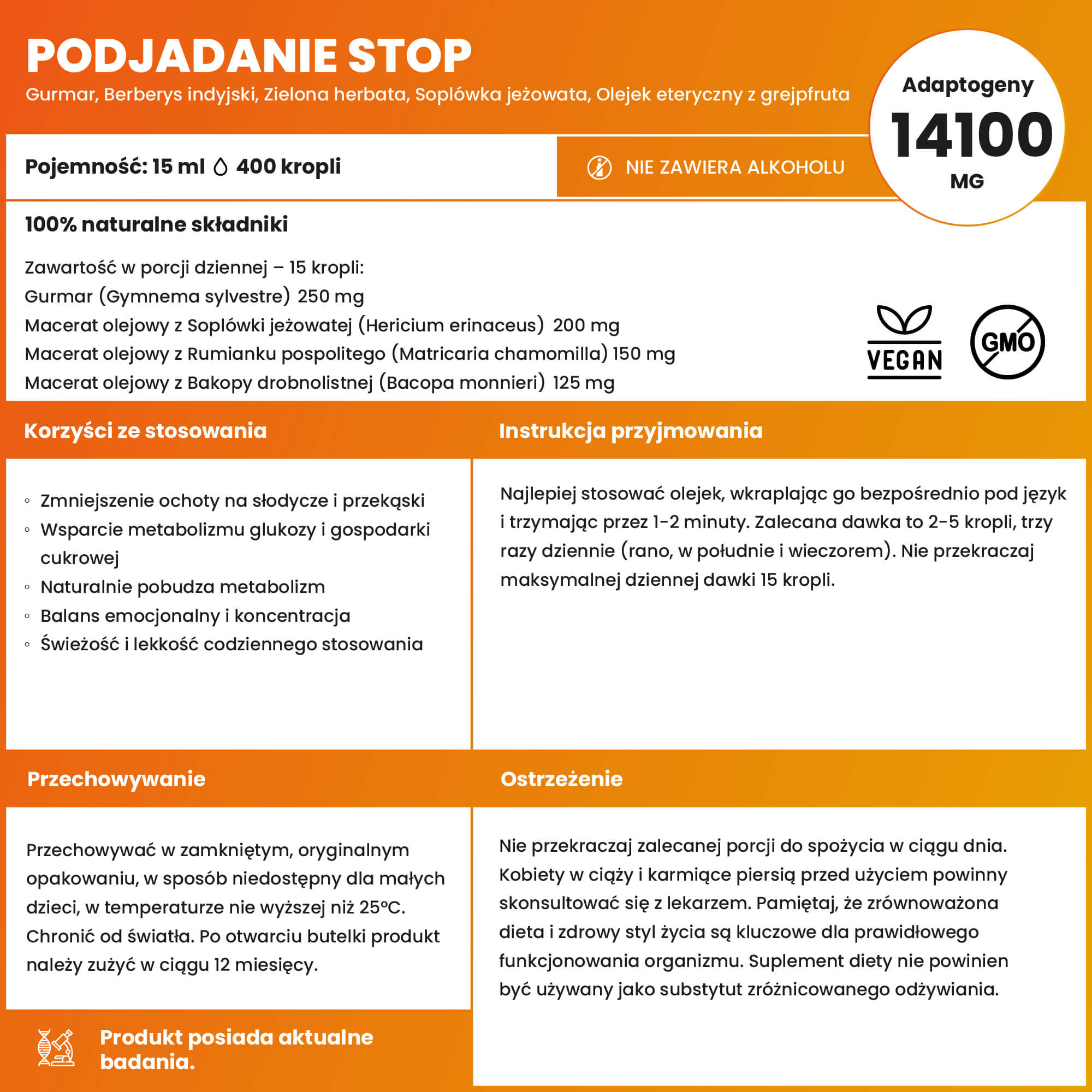 Dlatego powstało Podjadanie STOP – adaptogen w formie maceratu olejowego, który działa na źródła problemu: ogranicza ochotę na słodkie, stabilizuje poziom cukru we krwi i wspiera równowagę emocjonalną. To wsparcie dla Ciebie, jeśli chcesz odzyskać kontrolę nad apetytem, zatrzymać kompulsywne podjadanie i wreszcie zobaczyć realne efekty odchudzania.