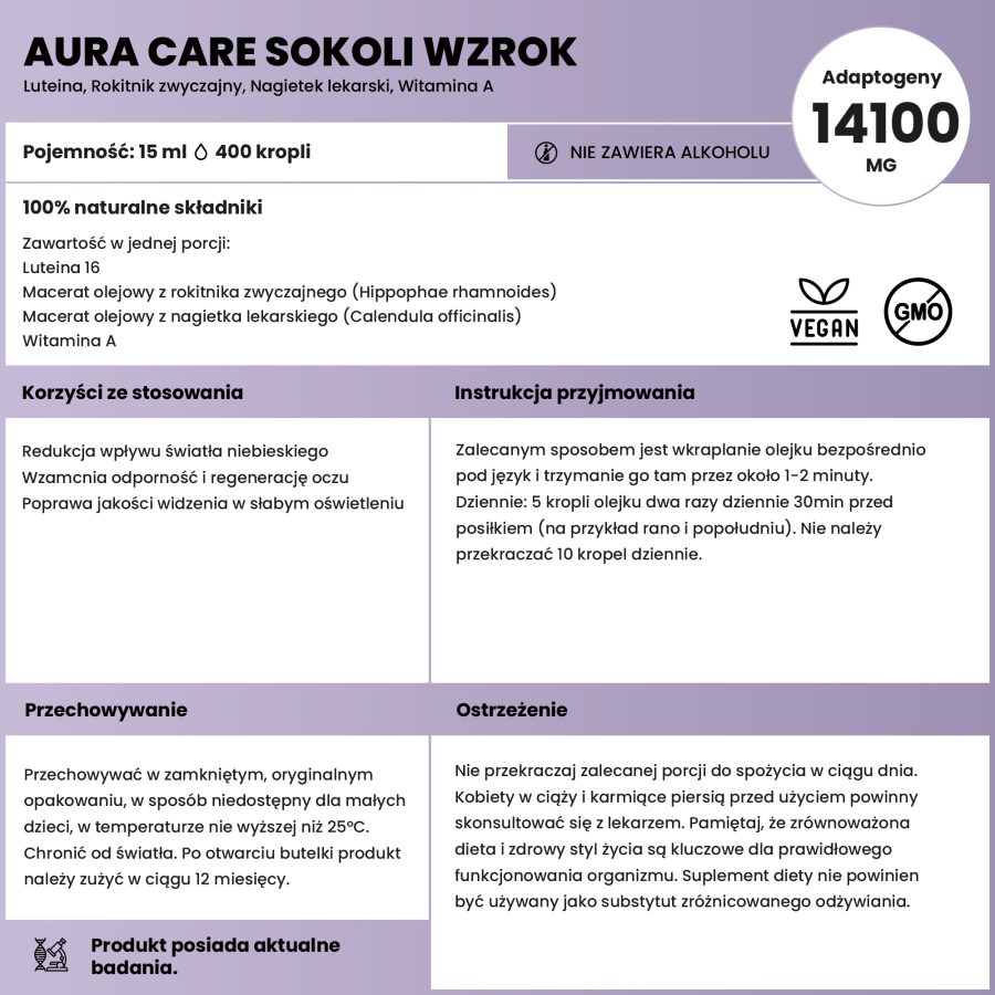 Sokoli Wzrok to przełomowy suplement, który łączy skuteczność ochrony oczu z wyjątkowym komfortem stosowania. W przeciwieństwie do tradycyjnych kropli do oczu, które mogą być nieprzyjemne i wymagają precyzyjnej aplikacji, Sokoli Wzrok przyjmujemy w formie olejku aplikowanego pod język. Ta metoda nie tylko omija dyskomfort związany z zakraplaniem, ale także pozwala na szybkie i efektywne wchłanianie substancji aktywnych do organizmu.