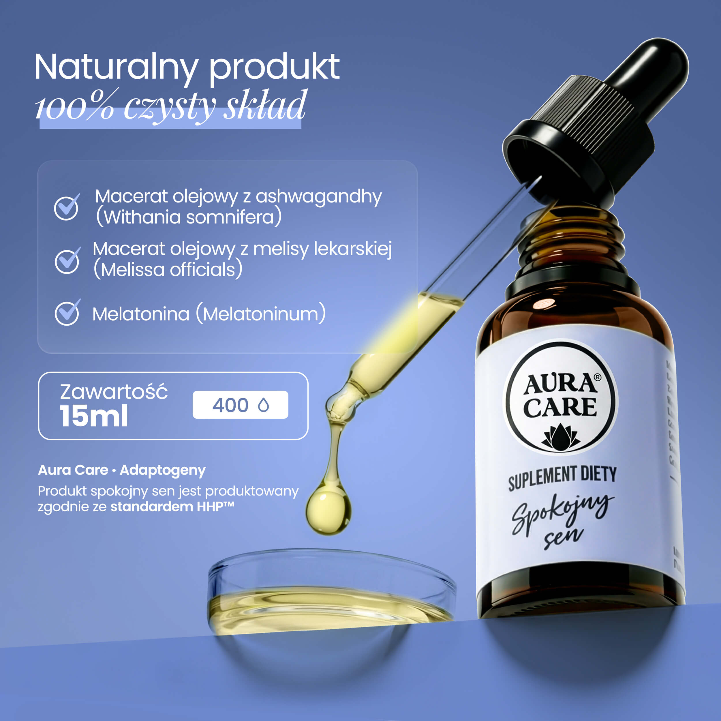 Aura Care „Spokojny Sen” – to Twoje naturalne wsparcie dla zdrowego, spokojnego snu. Dzięki składnikom o naturalnym pochodzeniu, adaptogeny na sen zawarte w olejku redukują napięcie, wpływają na relaksację i zapewniają regulację rytmu snu. Przyjmij „Spokojny Sen” na noc, ciesz się spokojnym i głębokim snem. Obudź się wypoczętym i gotowym na nowy dzień. Zapewnij sobie zasłużony odpoczynek i spokój podczas snu już dziś!