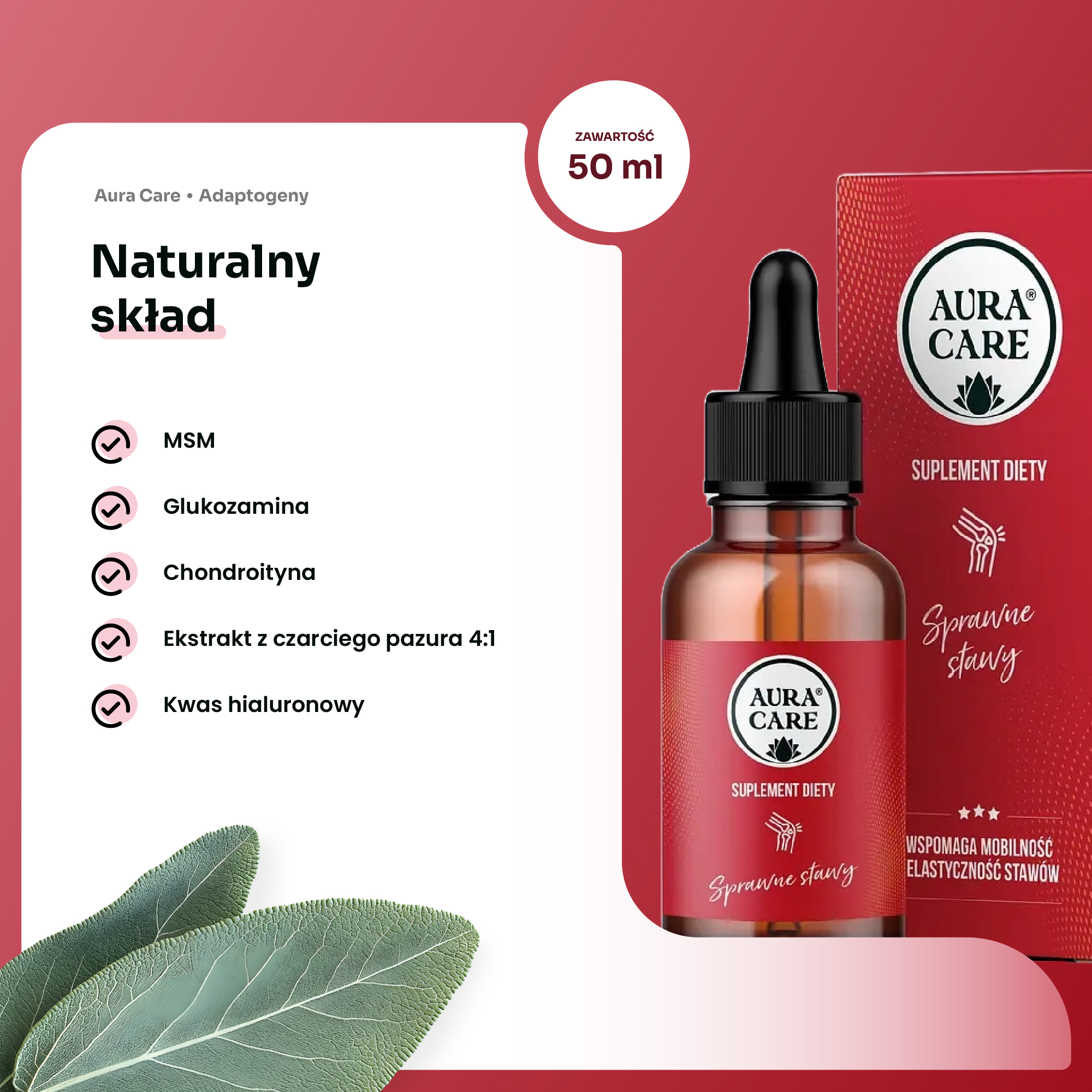 <b>Sprawne stawy</b><br> MSM, Glukozamina, Chondroityna, Ekstrakt z czarciego pazura, Kwas hialuronowy <br><small> Adaptogeny Aura Care | 50 ml</small>
