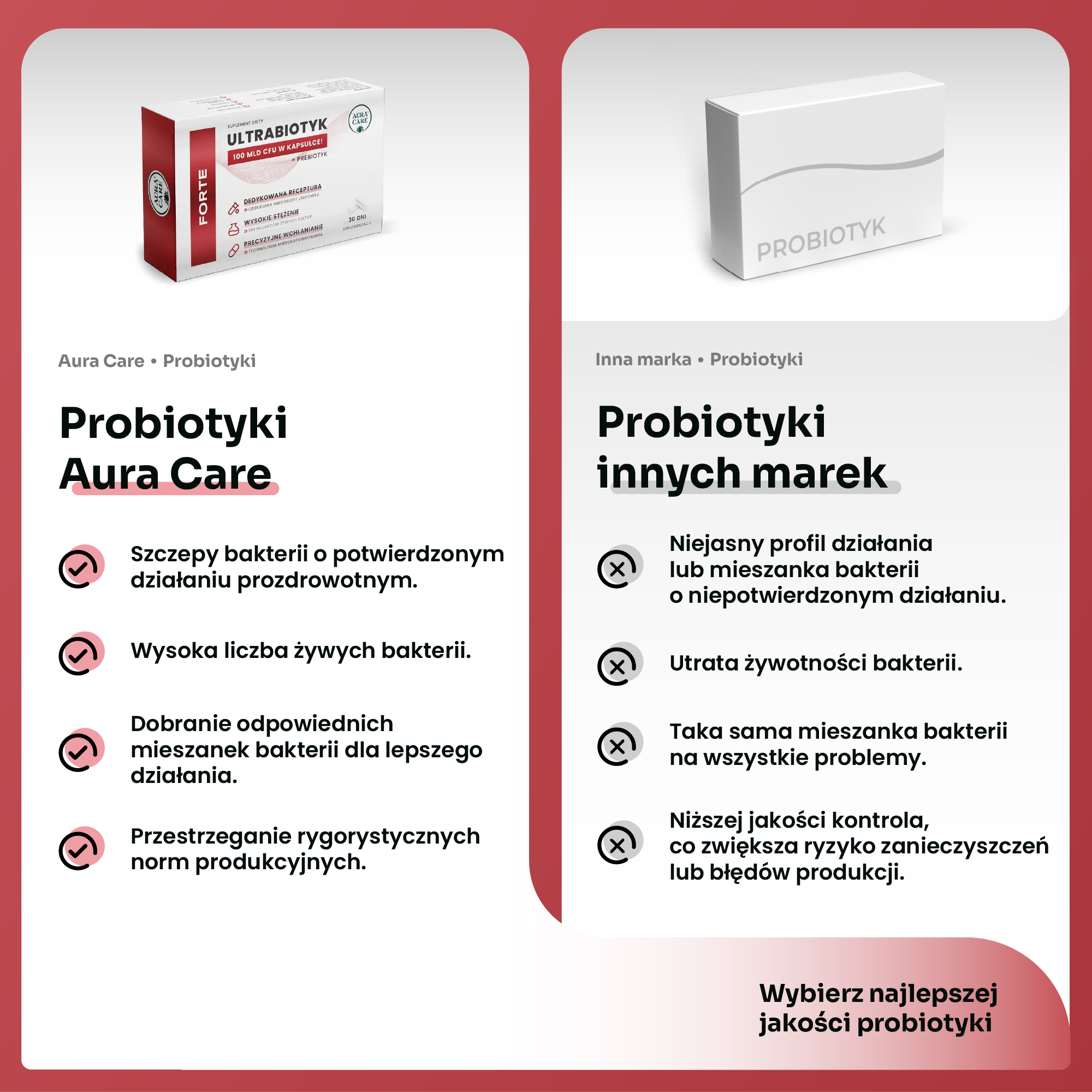 <b>Ultrabiotyk - FORTE</b><br> Probiotyk + prebiotyk, żywe probiotyki<br><small> Probiotyki Aura Care | 100 miliardów CFU</small>