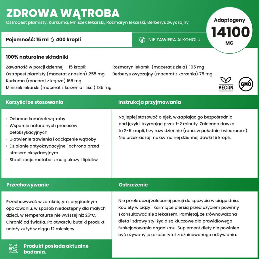 Dlatego powstała Zdrowa Wątroba – naturalna kompozycja pięciu maceratów olejowych, które wspierają procesy oczyszczania, chronią komórki wątroby i pomagają jej szybciej się regenerować. Bo lepiej zadbać o nią teraz – niż później zmagać się ze skutkami zaniedbań.